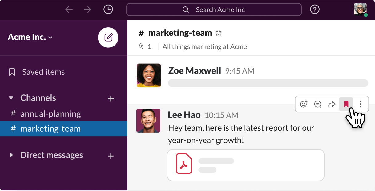 - Use Saved Messages / Reminders: Slack has 2 great features to work as tasks and memories. For any message you receive, in it’s settings you can select “Add to saved items” or under more settings you can select “remind me about this”. Reminders will send you a new message once time is up, all saved items are listed under saved items menu which you can use as accessing easily, or as a task list.